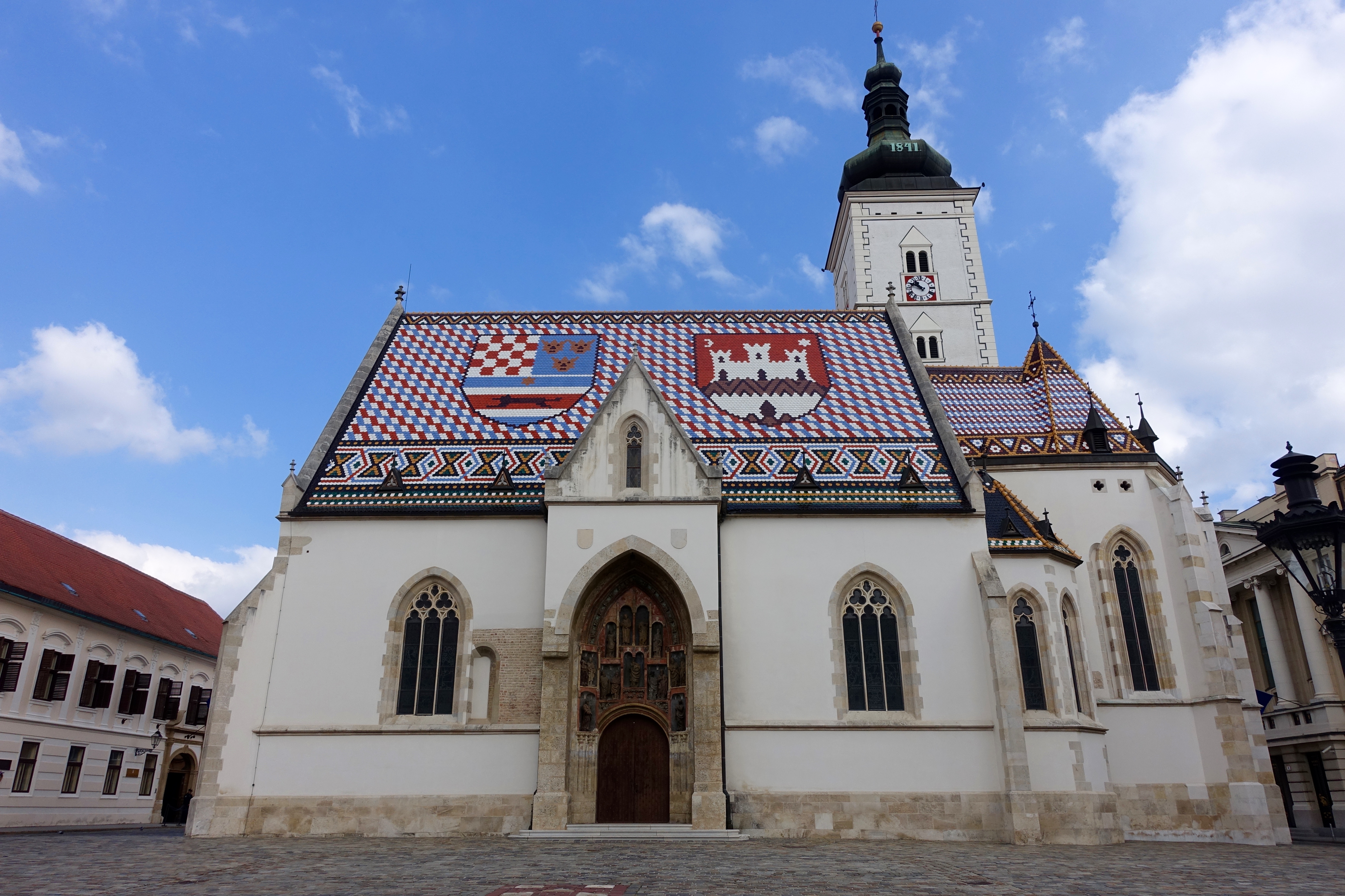 Nearby is St. Mark’s Church, which is one of the most unique looking old buildings I’ve seen. The church was built in the 13th Century, and the tiles on the roof were added in the 1800’s. The colorful tiles have the medieval coat of arms of Croatia, Dalmatia and Slavonia on the left side, and the emblem of Zagreb on the right.