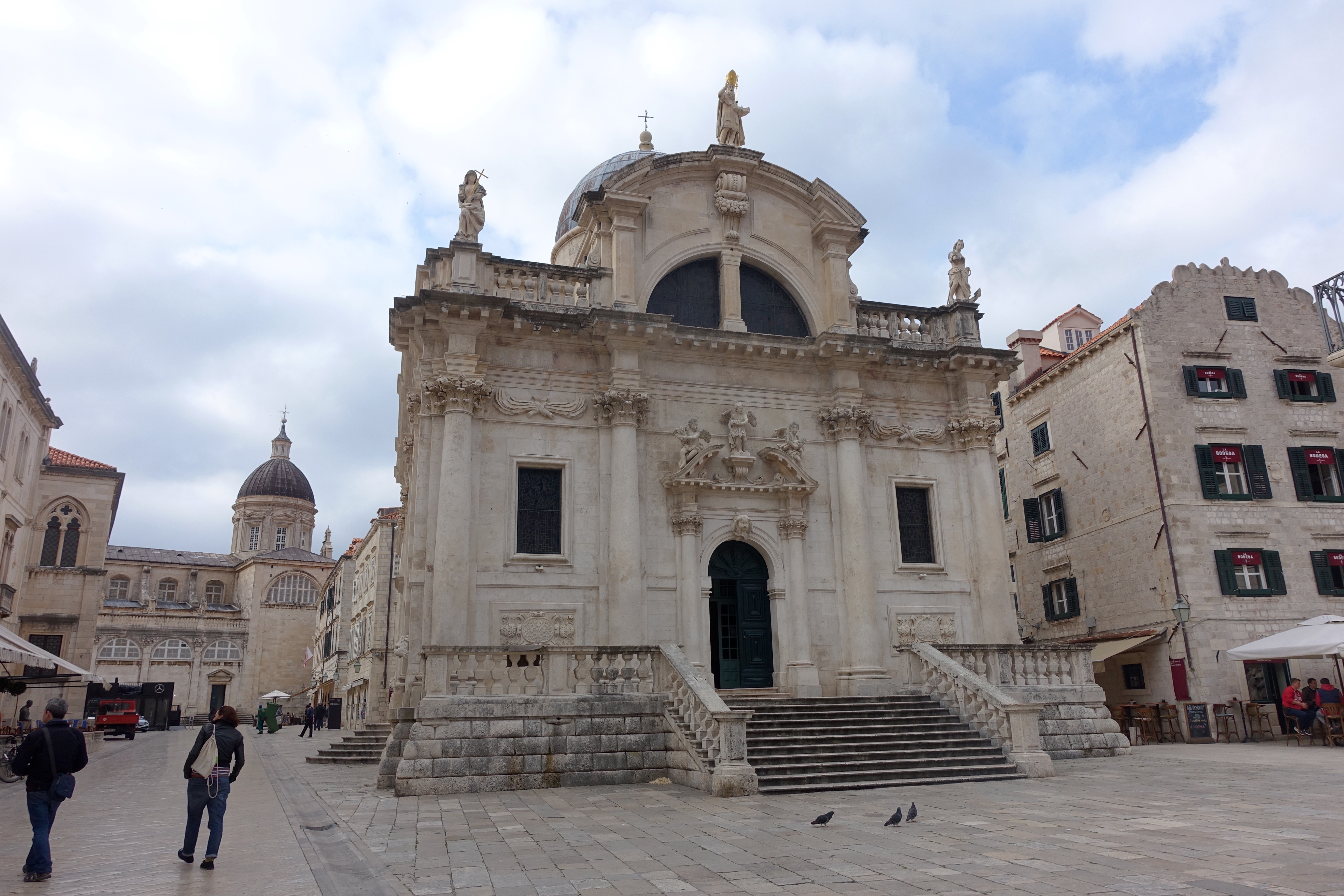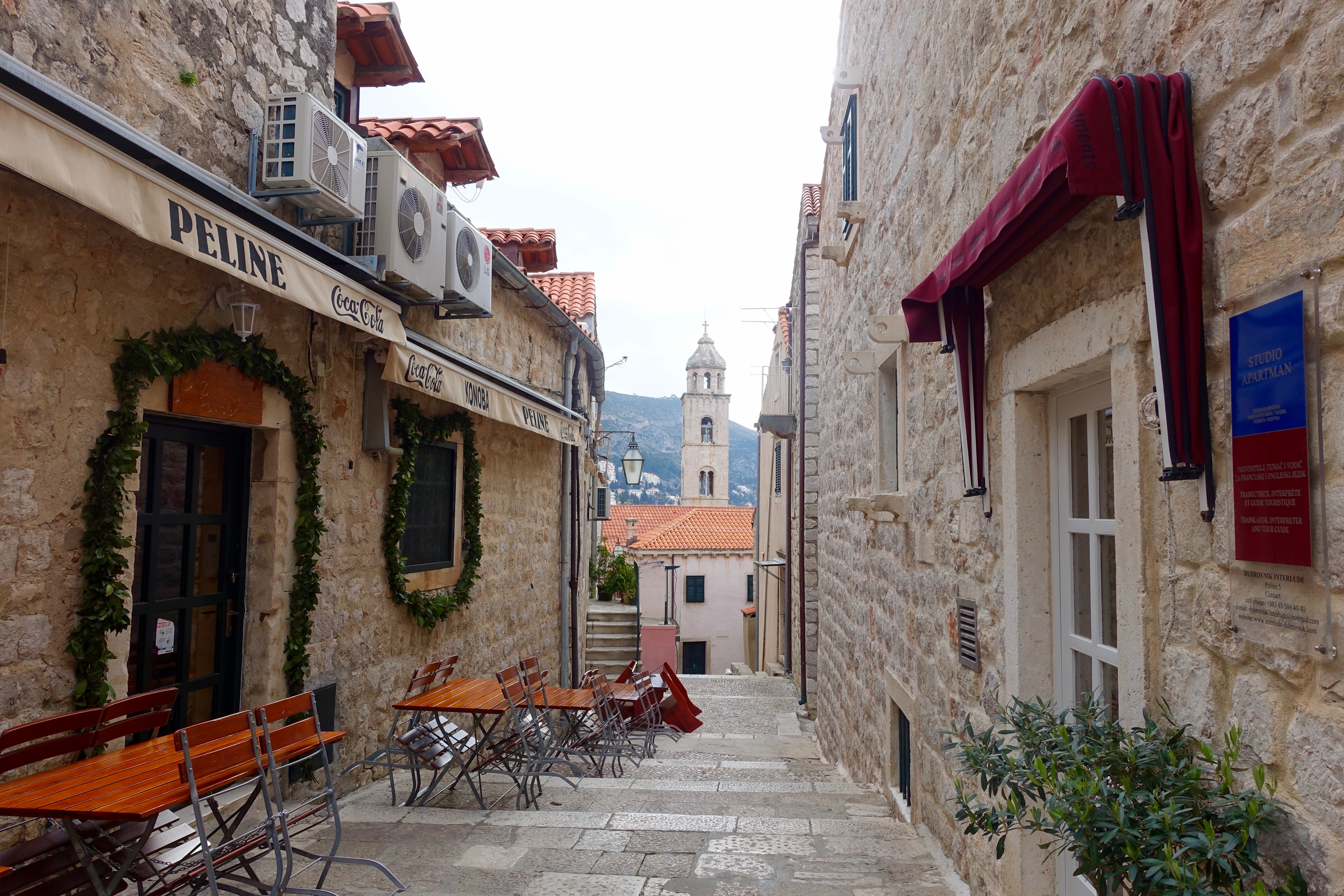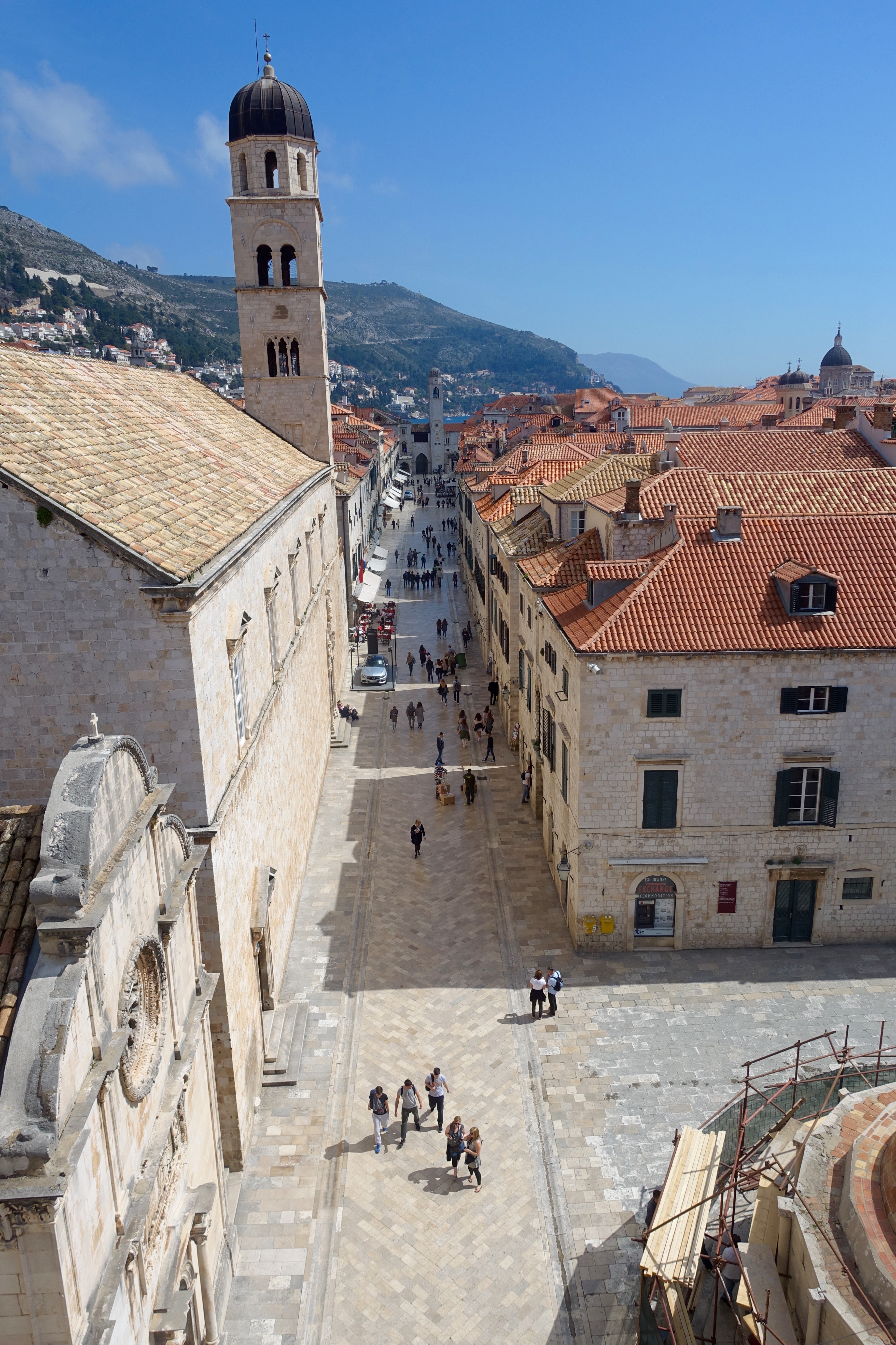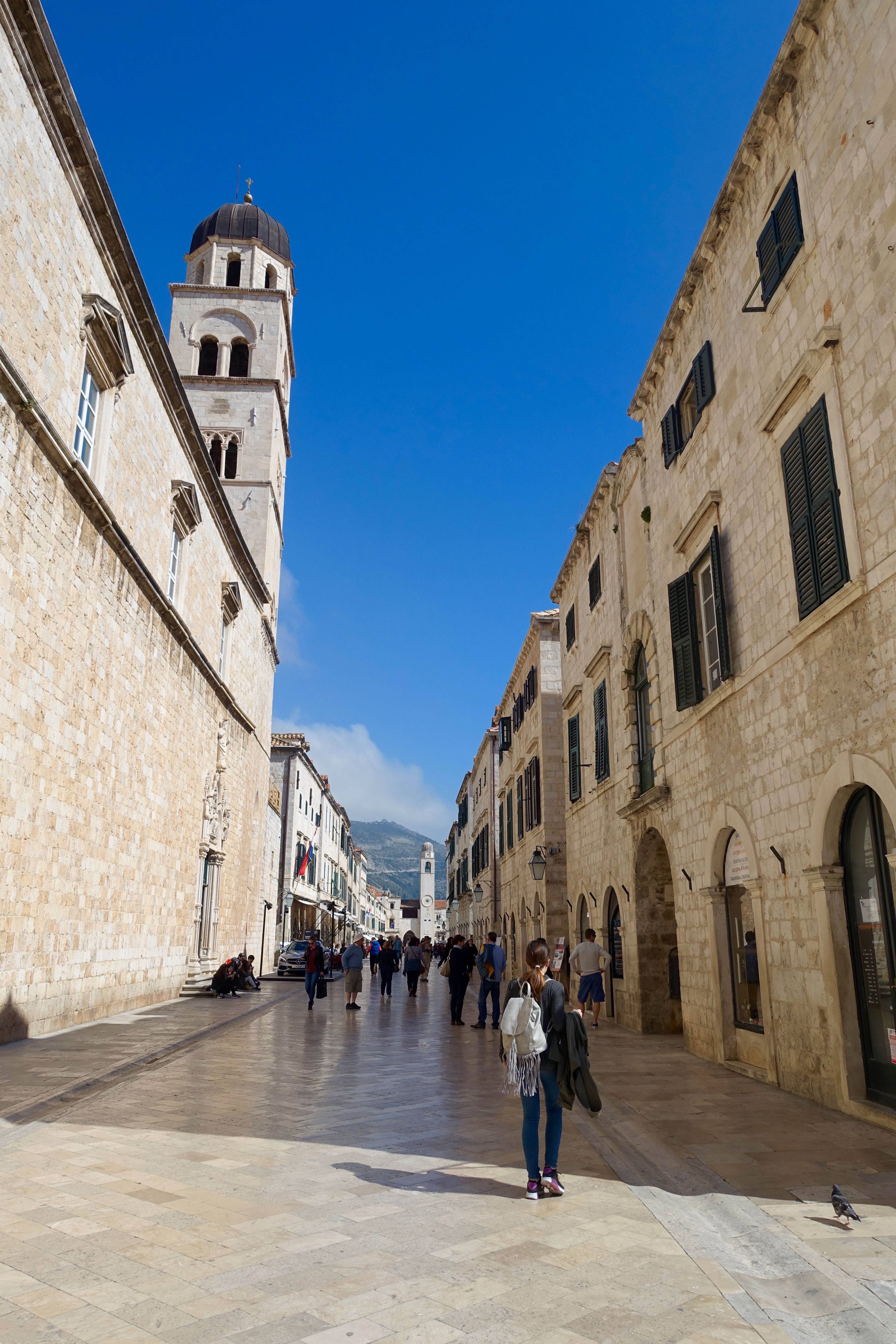 The basics: Dubrovnik was founded in the 7th Century, and it gets it’s name from the forest of oak trees that once grew on Mount Srdj on the hillside above (‘dubrava’ = ‘oak’). There are three land gates that leave the Old City – Pile, Ploce, and Buza. Pile is the main gate now, and it is a two minute walk from my apartment I’m renting:) There are no cars allowed inside the Old City (it would be impossible to drive one inside anyway). Of course, there are endless standards regarding how the buildings can look, their color, etc., to preserve the cultural integrity. The town is very small, so you can walk up and down every single street in probably less than an hour. The city wall is 1.2 miles long, and it took me over two hours to walk it because I kept stopping to take pictures, take it all in, etc.☺️ Dubrovnik is part of Dalmatia, one of Croatia’s ‘historical regions’ (this means it is designated for historical purposes only, nothing to do with government). It’s on the Adriatic Sea, which, along with the Ionian, connects to the Mediterranean. The main street is Stradun Street..